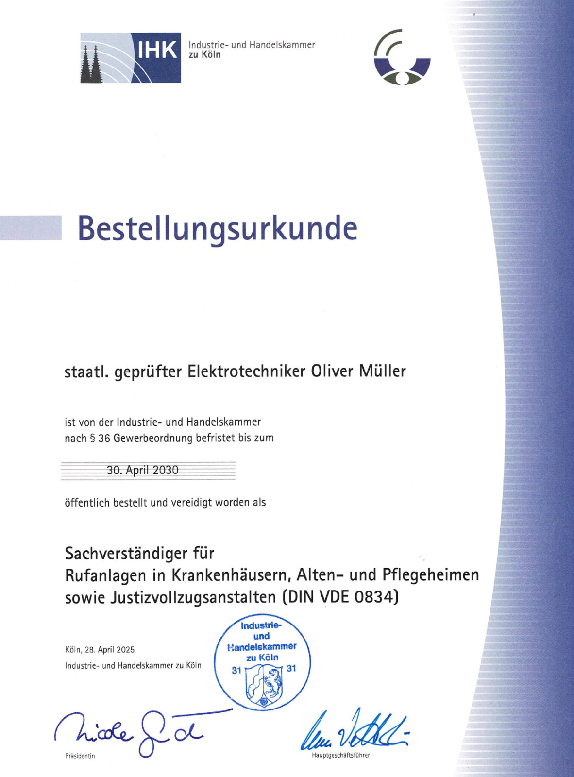 Meine öffentliche Bestellung als Sachverständiger des Sachgebietes “Rufanlagen in Krankenhäusern, Pflegeheimen und Justizvollzugsanstalten” wurde erfolgreich bis 2030 von der IHK zu Köln bestätigt und verlängert. Die Entscheidung zur Verlängerung erfolgte nach Prüfung der fachlichen Qualifikation, der regelmäßigen Weiterbildung sowie der bisherigen Tätigkeit als öffentlich bestellter und vereidigter Sachverständiger.